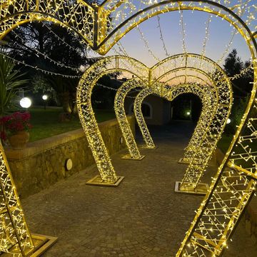 Struttura LED 3D autoportante a forma di cuore. Il tunnel è composto da 4 cuori di dimensioni: H-2,5m, larghezza - 2,9m, profondità 50cm alla base. Lunghezza complessiva tunnel - 10m.