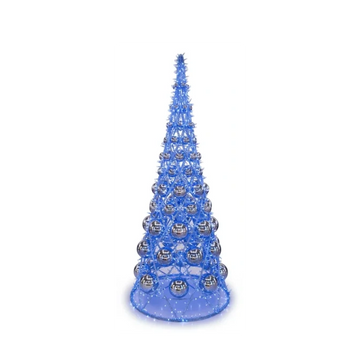 Struttura in alluminio allestita con luci a LED di colori di luce blu con flash freddo in alcuni diodi. Illuminazione LED a bassa tensione, sicura e di alta qualità. Addobbato con sfere argento di vari dimensioni. Dimensioni: Diametro base-85cm, H-200cm.